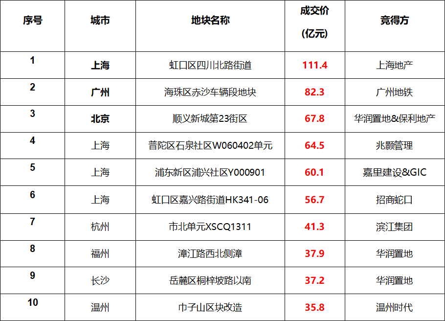 表:全国住宅用地成交总价TOP10(全市口径数据)