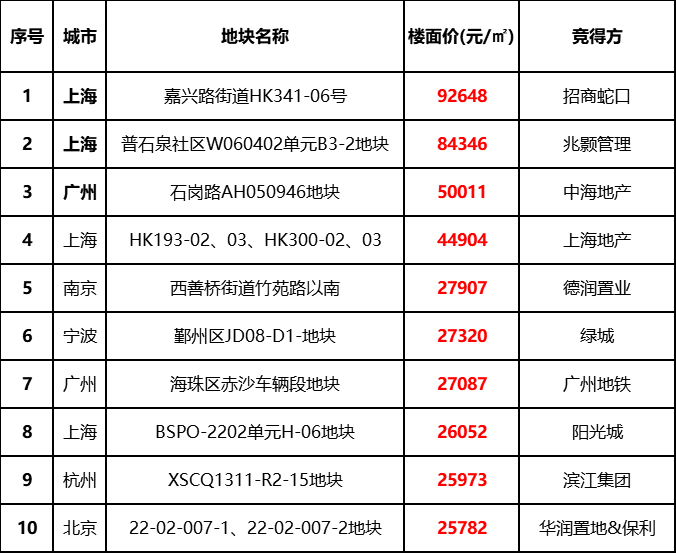 ▌宅地单价TOP10:榜单均价走低,上海虹口区宅地居首