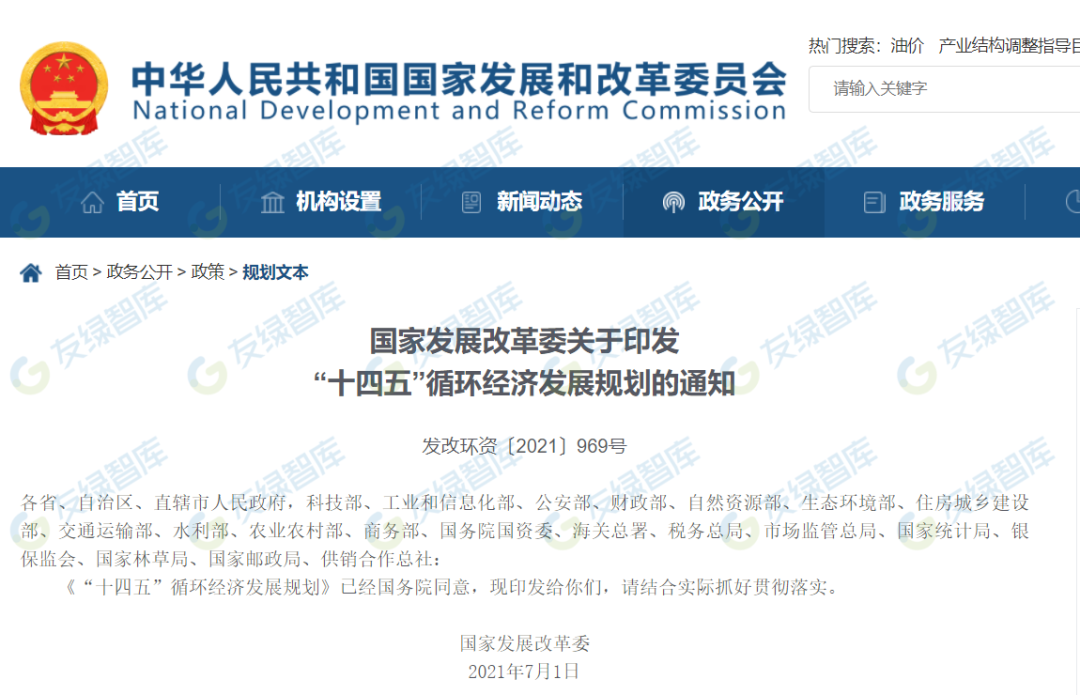 《“十四五”循环经济发展规划》提出了循环经济多项具体目标。