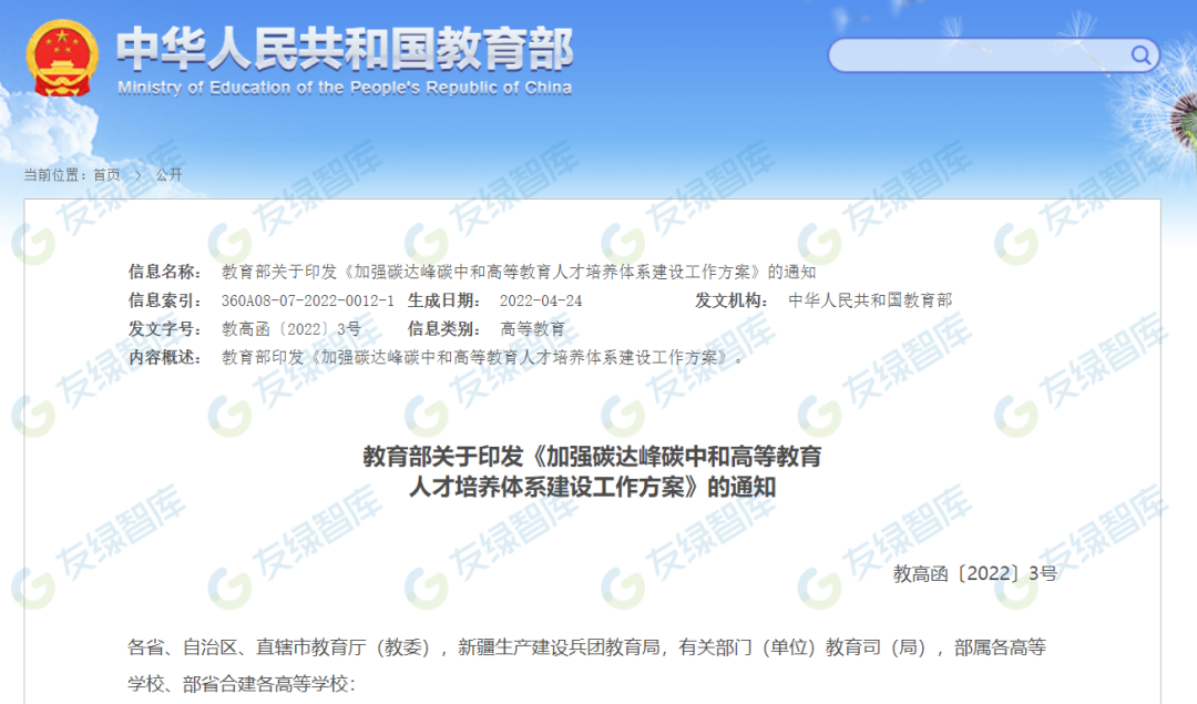 2022年5月7日《加强碳达峰碳中和高等教育人才培养体系建设工作方案》