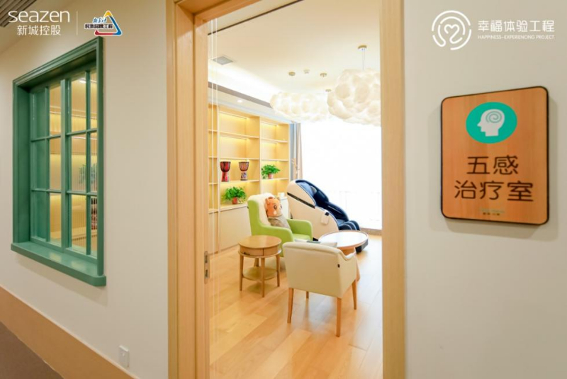 南京新城·心颐荟在8楼专门构建提供给认知症长者的记忆家园,并特别建立了五感疗愈认知症照护模型,借助专门的五感治疗室,长者可以通过视觉、嗅觉、听觉、味觉、触觉的感知来实现感官功能训练。