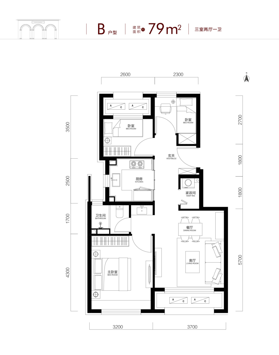 这个建筑面积约79平米的三室两厅户型,功能非常强大,除了南北通透、景观飘窗、独立家政间以外,还有好用的U型厨房,可变的居室空间,三分离的卫生间等等,收纳功能也是厘米级的存在。
