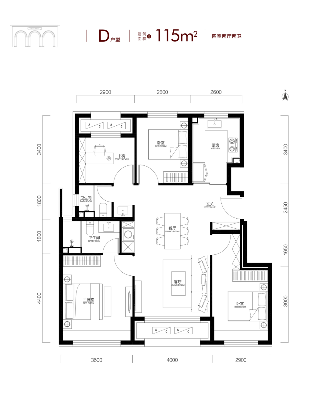 115平米的四室两厅两卫户型,南向面宽达到了约10.5米,卧室带飘窗,全明格局。每个房间都设置了收纳空间,两个相邻的北向卧室,空间可变,可以打通为一间,也可以用推拉门隔开。市场上能做到如此功能的户型,多在150平米以上。