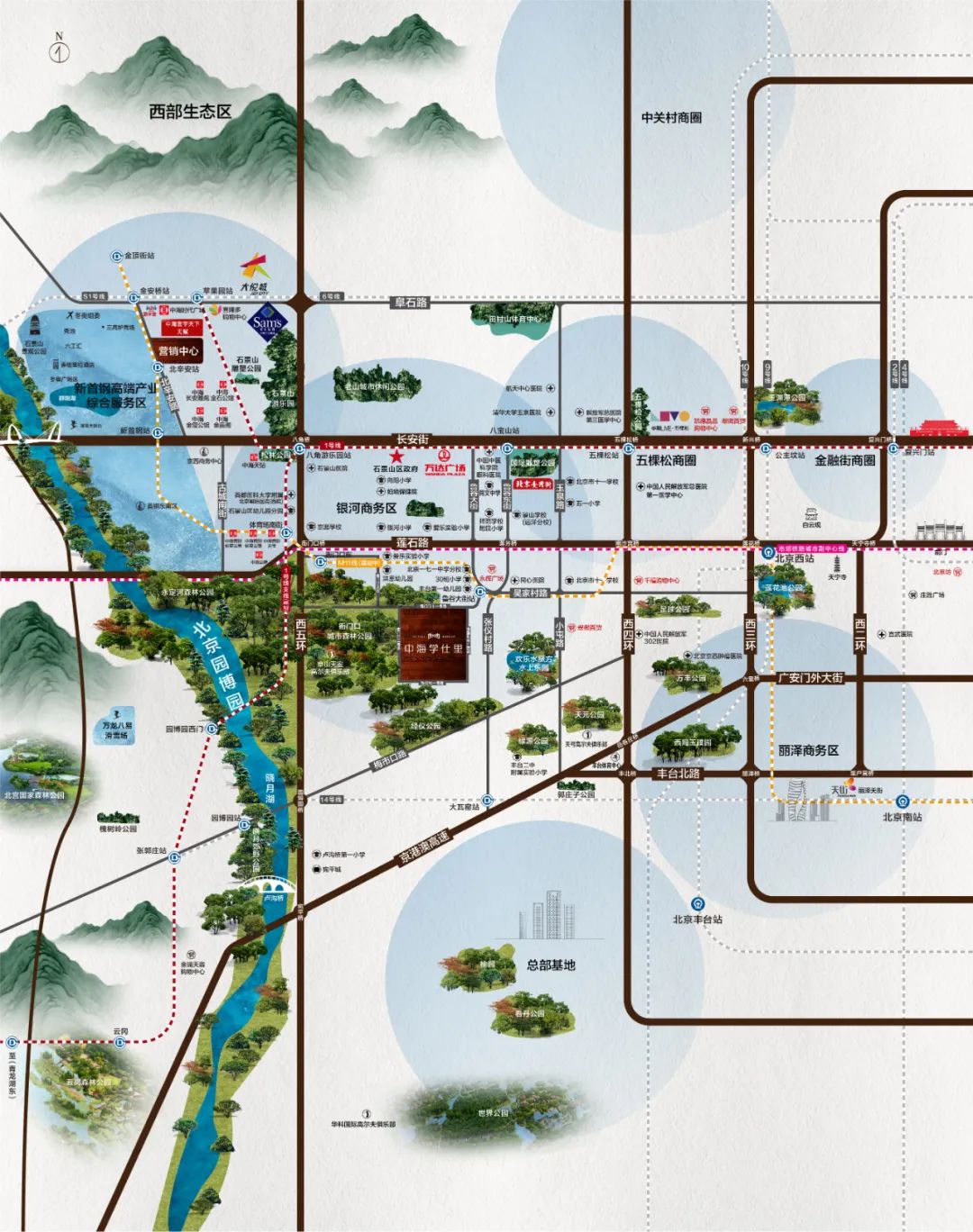 中海学仕里西边10分钟直达成熟的万达商圈,包括万达广场、泰禾长安中心、台湾街等石景山核心商业、美食地标。