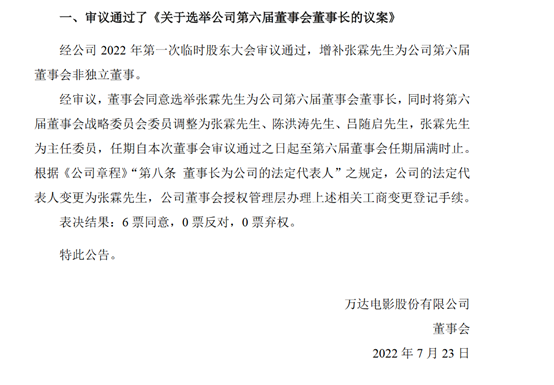 大公房产讯 7月22日,万达电影发布公告称,公司第六届董事会第五次会议决...