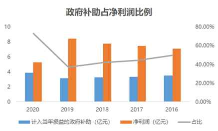 近五年,政府补助在净利润中的占比分别达72.7%、37%、42%、44.12%以及49.86%,共计达17.06亿元。