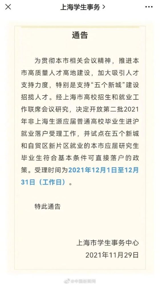开放第二批2021年非上海生源应届普通高校毕业生进沪就业落户受理工作,