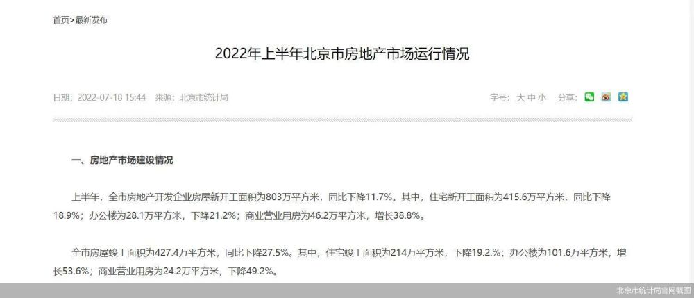 销售方面,北京市统计局数据显示,上半年全市商品房销售面积为446.1万平方米,同比下降8.7%。其中,住宅销售面积为329.9万平方米,下降20%。