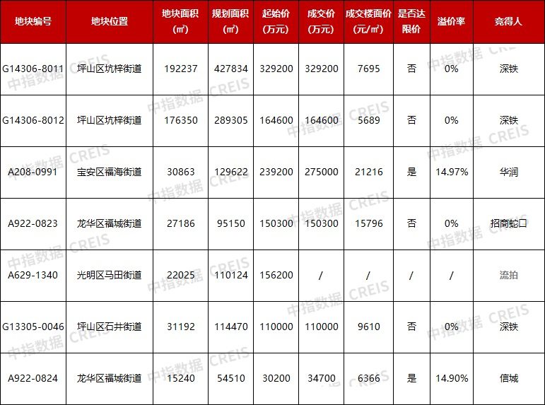 成功出让的6宗地块,3宗由深铁竞得,华润、招商蛇口及信城各竞得1宗地;底价成交4宗,2宗触及中止价。