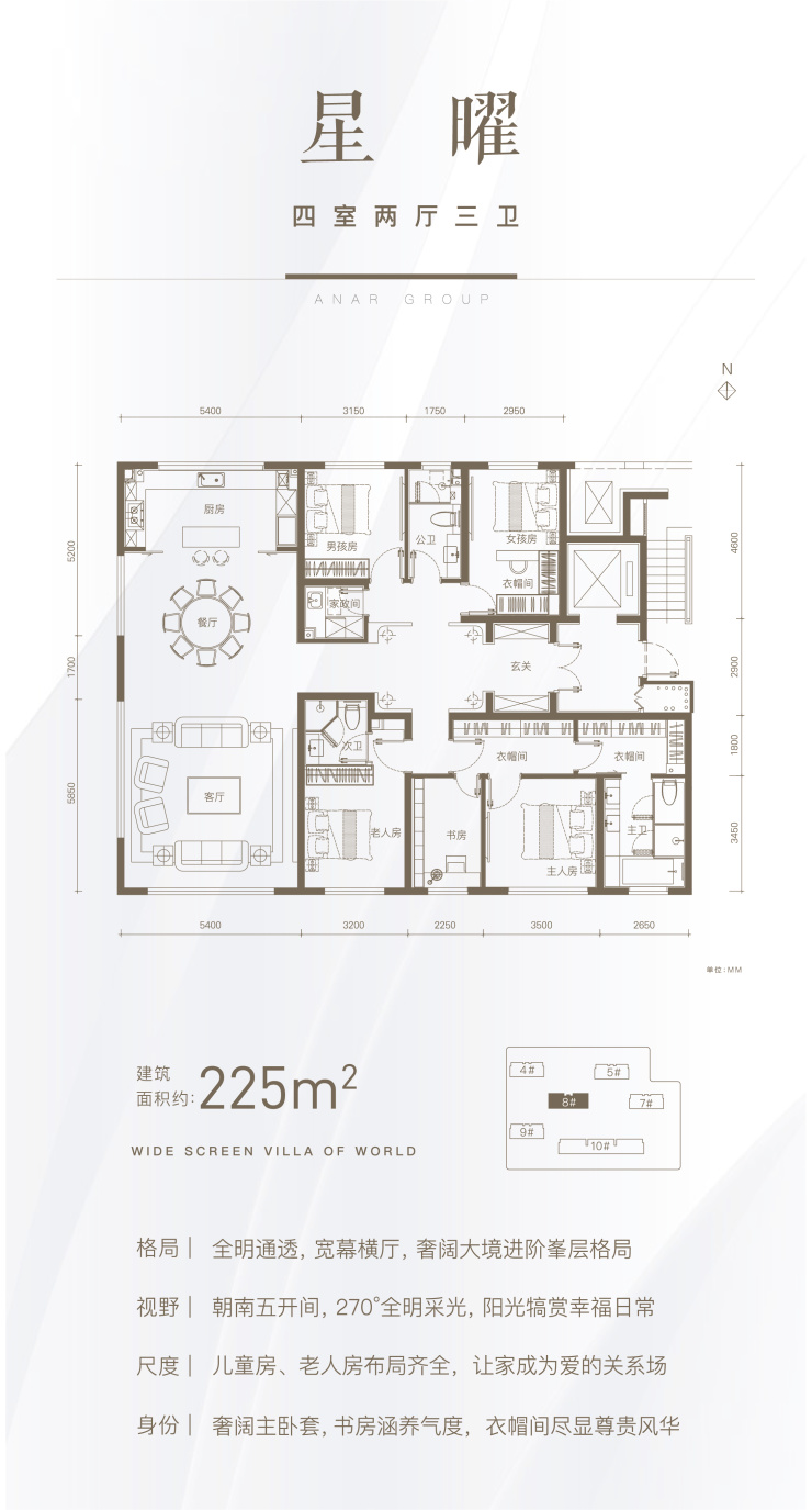 人生进阶,更懂生活境界。225㎡标准4+1墅级进阶空间,为家族居住哲学给出了答案。私属奢阔门厅,入户玄关设计、清晰起居动线、独立家政空间……墅级奢标尺度,满足名门世家每一位家庭成员的个性空间需求。