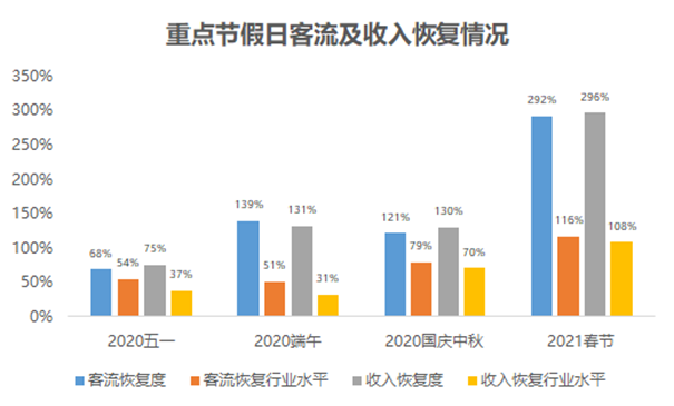 而在节假日,融创文旅的表现也十分亮眼。据融创披露,在2020年4个重点节假日——五一、端午、中秋国庆以及2021年春节假期里,融创文旅均实现了远超行业平均水平的恢复。