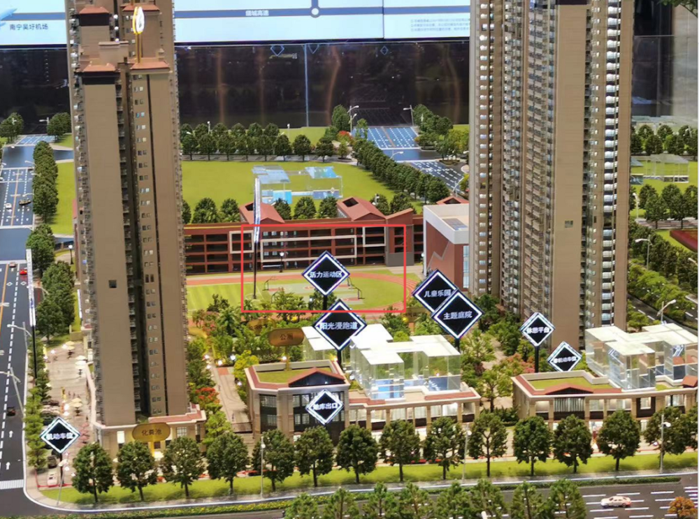 而且业主还发现销售时在沙盘中所展示的小区内的“活力运动区”现已被2米高的实体围墙分隔,并划归庆林路小学作为篮球场使用。