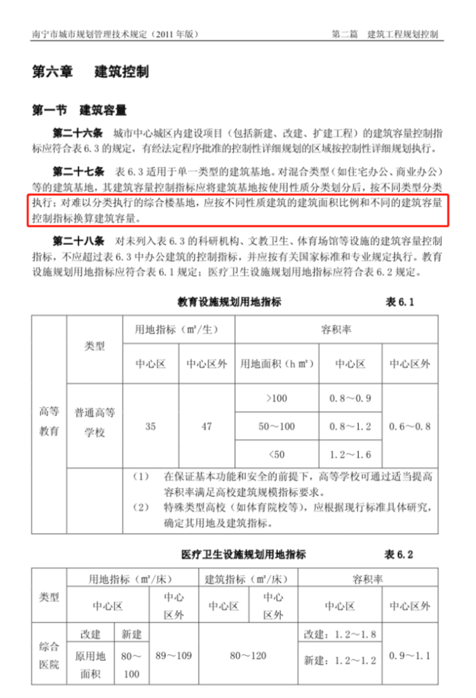 但业主计算出来的结果却与开发商承诺的4.0容积率完全不符。且依据《南宁市城市规划管理技术规定(2011版)》第六章第一节第二十条规定,对混合类型的建筑基地,其建筑容量控制指标应将建筑基地按使用性质分类划分后,按不同类型分类执行。