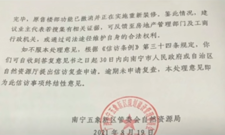 8月19日,相关部门也对业主们的申诉做出了书面回应。