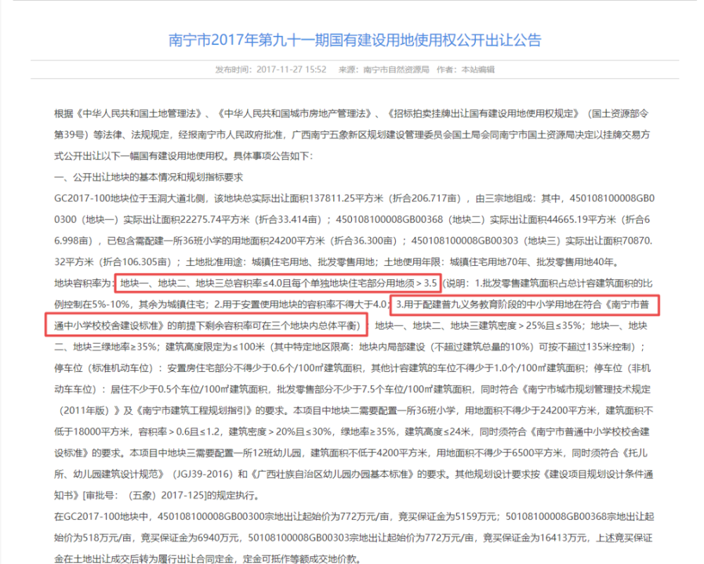 第一是回复了该项目拿地建设的基本情况。该项目是由三个开发商共同联合开发,经过竞拍的方式合法购得的,项目目前也已基本建设完成,正处于收尾的阶段。根据该项目当时的土拍公告显示,地块容积率为:地块一、地块二、地块三总容积率小于等于4.0并且每个单独的地块住宅部分用地须需大于3.5(用于配建普九义务教育阶段的中小学用地在符合《南宁市普通中小学校校舍建设标准》的前提下剩余容积率可在三个地块内总体平衡)。绿化率方面,三个地块的要求是大于35%。