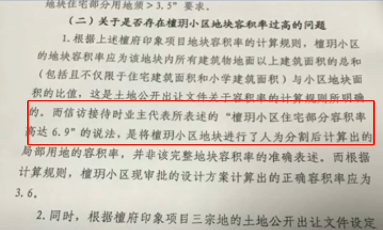 第二是回复了业主们所反应的小区容积率超标的问题。相关部门在经过核查计算得出,檀玥小区的容积率是符合要求的。而业主们计算得出了6.9的容积率,是因为与开发商方面的计算方式不同。三个地块的整体容积率为小于等于4.0并且每个单独的地块住宅部分用地须需大于3.5,正确的方式是要一起算,所以得出的容积率是3.6,而业主们的计算方式则是把土地进行人工分割之后进行计算。