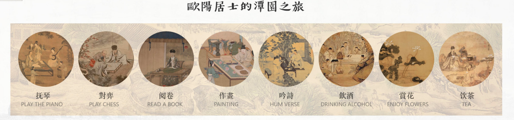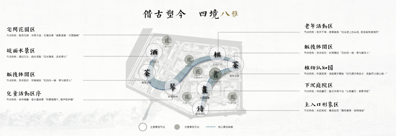 其中,四境八雅借鉴了欧阳居士的谭园之旅,由「琴、棋、书、画、诗、酒、花、茶」八种元素组成,每种元素所代表的景观功能不同。