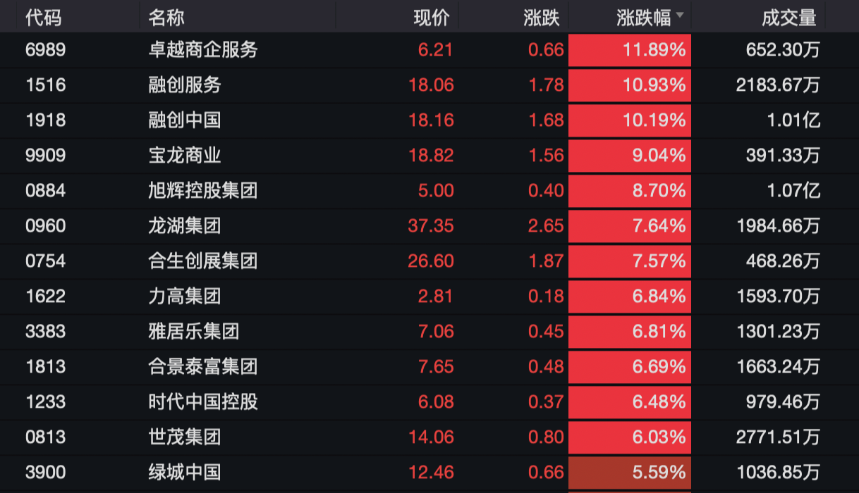 其中,卓越商企服务以11.89%的涨幅位居首位,融创服务、融创中国涨幅在10%以上,旭辉控股、龙湖集团涨幅居前。合生创展集团盘中涨幅一度超12%,至收盘回落至7.57%,收报26.6港元。