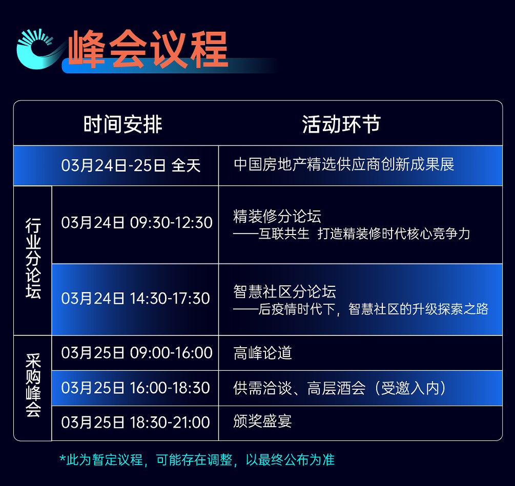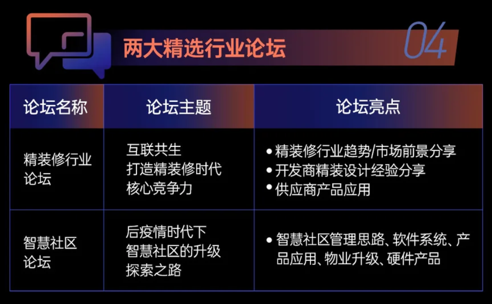 本次峰会特设“精装修”、“智慧社区”两大专业论坛,我们分别邀请了深圳家协住宅精装研究院、奥维云网等行业大咖莅临分享。现场,他们将从亲历者,助力者和观察者三个维度来讨论行业的变与不变,共话精装修、智慧社区在房地产供应链数字化转型之路的思考与洞察。