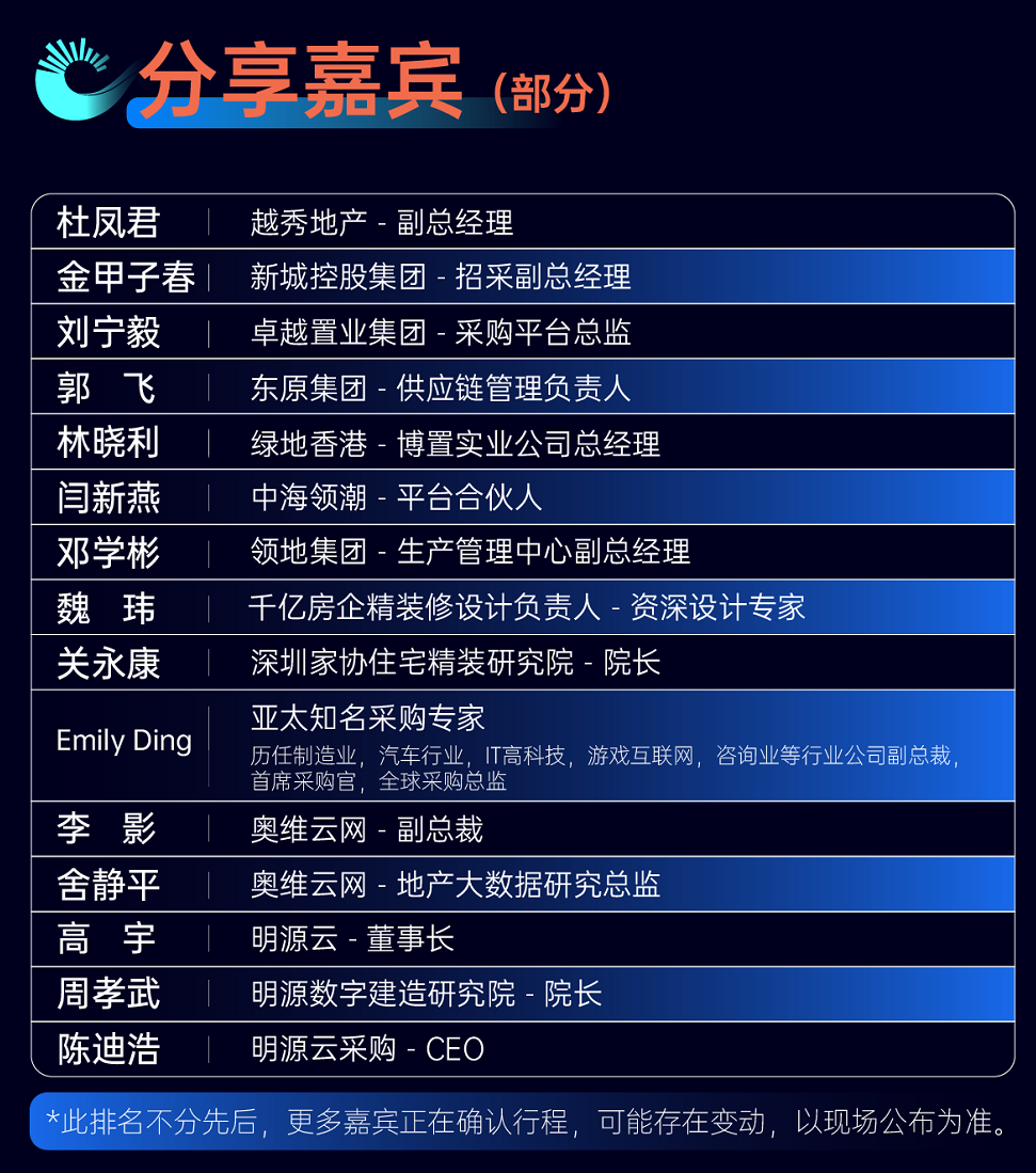 这些实战操盘手们,不仅会用他们专业、深度和前瞻性视角,从宏观层面给出行业发展的前瞻指引,还将围绕地产供应链变革、数字化转型等板块和您聊个畅快。