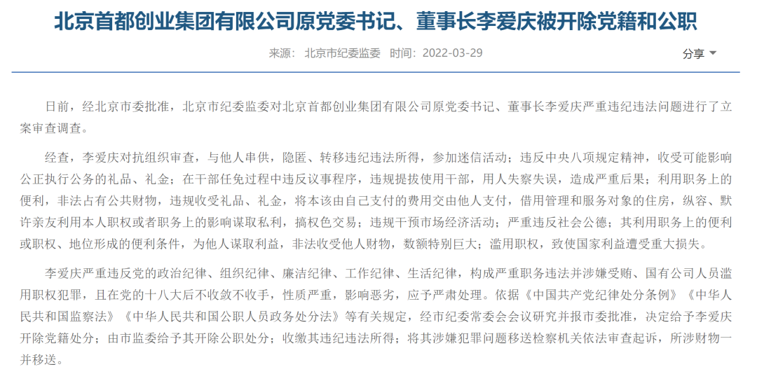 北京市纪委监委3月29日消息,日前,经北京市委批准,北京市纪委监委对北京首都创业集团有限公司原党委书记、董事长李爱庆严重违纪违法问题进行了立案审查调查。
