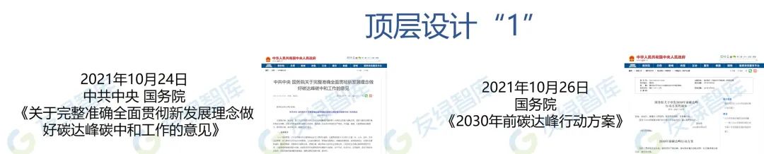 2021年10月24日发布《中共中央 国务院关于完整准确全面贯彻新发展理念做好碳达峰碳中和工作的意见》,作为“1”,是管总管长远的,在碳达峰碳中和“1+N”政策体系中发挥统领作用;意见与同年10月26日国务院发布的《2030年前碳达峰行动方案》共同构成贯穿碳达峰、碳中和两个阶段的顶层设计。“N”则包括能源、工业、交通运输、城乡建设等分领域分行业碳达峰实施方案,以及科技支撑、能源保障、碳汇能力、财政金融价格政策、标准计量体系、督察考核等保障方案。一系列文件将构建起目标明确、分工合理、措施有力、衔接有序的碳达峰碳中和政策体系。