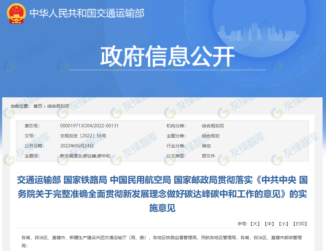 2022年6月24日,交通运输部 国家铁路局 中国民用航空局 国家邮政局贯彻落实《中共中央 国务院关于完整准确全面贯彻新发展理念做好碳达峰碳中和工作的意见》的实施意见印发。提出坚持“全国统筹、节约优先、双轮驱动、内外畅通、防范风险”的总方针,落实国家碳达峰碳中和工作部署要求,统筹处理好发展和减排、整体和局部、长远目标和短期目标、政府和市场的关系,以交通运输全面绿色低碳转型为引领,以提升交通运输装备能效利用水平为基础,以优化交通运输用能结构、提高交通运输组织效率为关键,加快形成绿色低碳交通运输方式,加快推进低碳交通运输体系建设,让交通更加环保、出行更加低碳,助力如期实现碳达峰碳中和目标,推动交通运输高质量发展。
