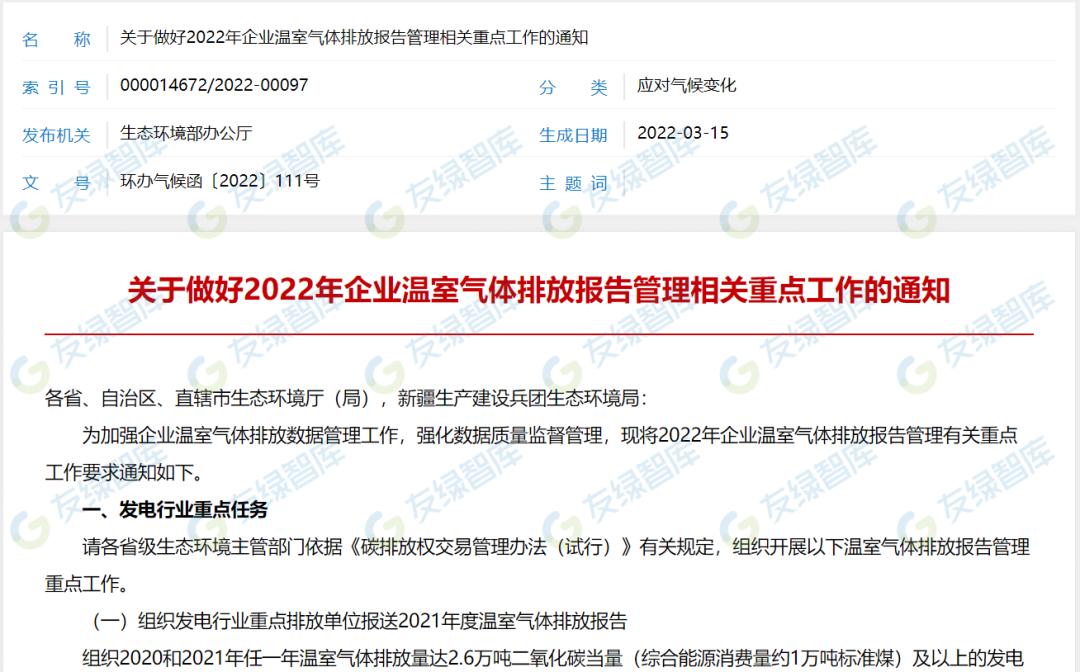 2022年3月15日 《关于做好2022年企业温室气体排放报告管理相关重点工作的通知》
