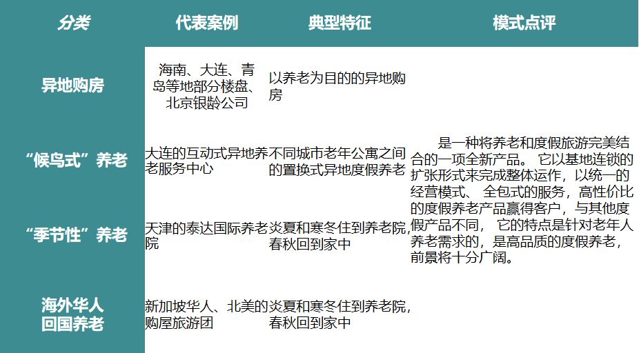 非主流养老方式,健康且具有一定经济实力的老年人通过异地购房,异地旅游和养老相结合,灵活性强。