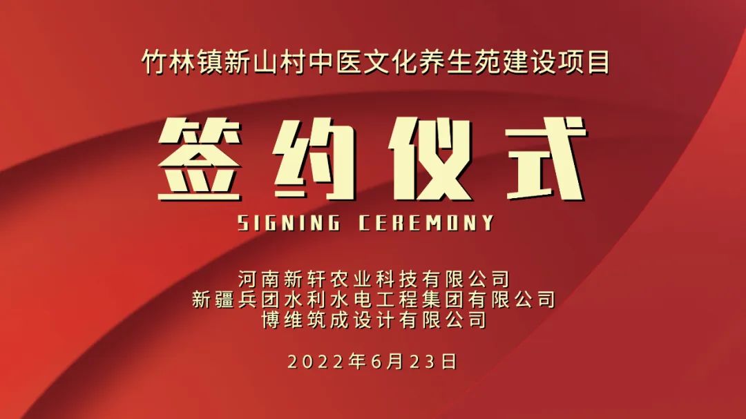 2022年6月23日上午,河南新轩农业科技有限公司与新疆兵团水利水电工程集团有限公司、博维筑成设计有限公司,关于竹林镇新山村中医文化养生苑建设项目的签约仪式于博维筑成内部隆重举行。