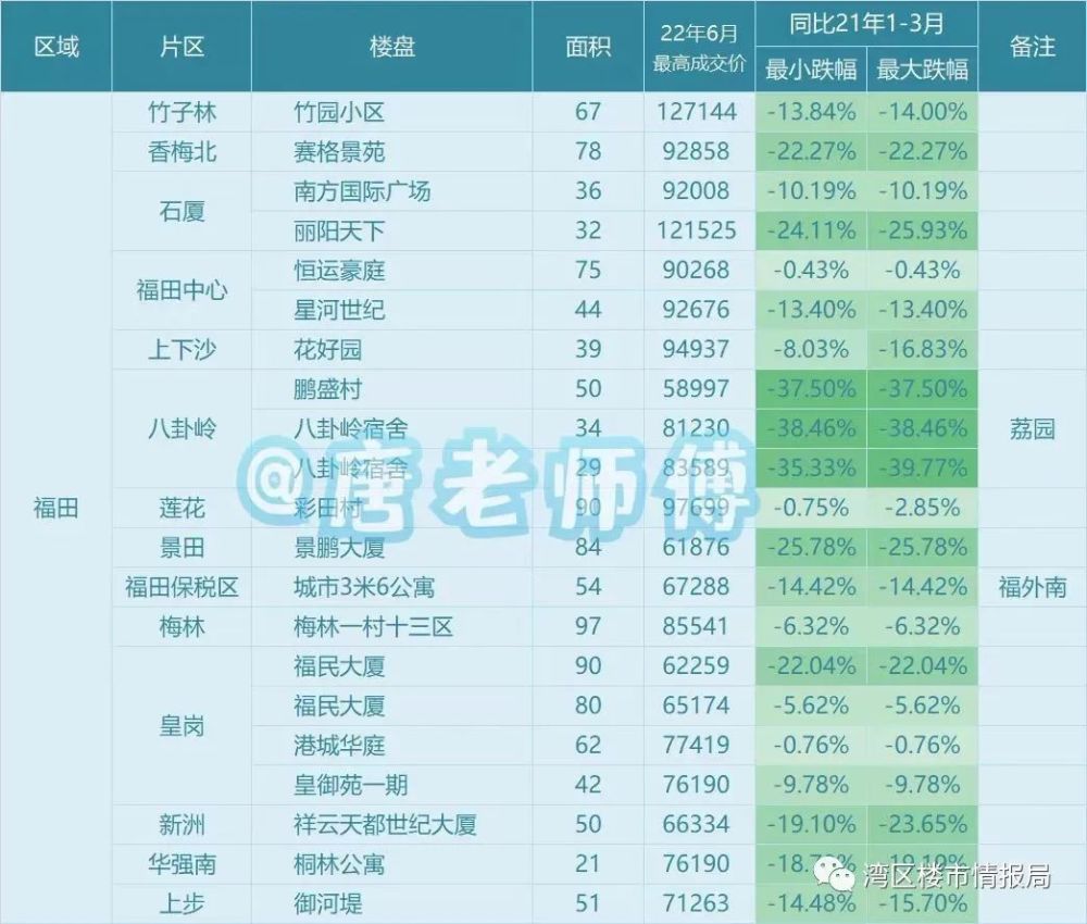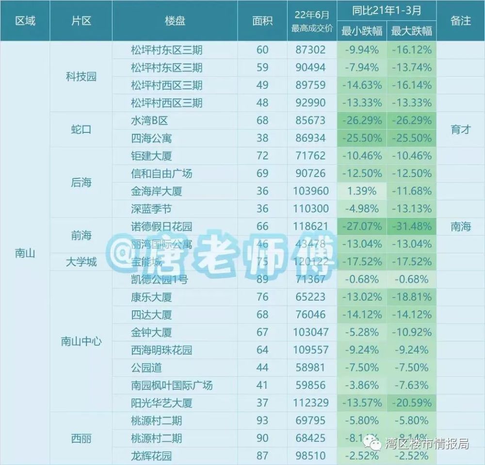 截止2022年6月最高成交价118621元,杀跌最大跌幅31.48%;另外水湾B区,典型的老破小,下跌26.29%;四海公寓下跌25.5%,公寓也只能少碰为妙了。