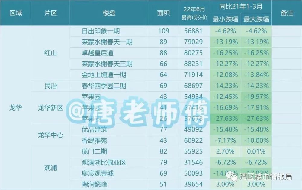 龙华片区有个新特点:观澜有两个样本价格不仅没降,还上涨了。一个是珑门二期,上涨2.7%;一个是陶润懿峰,上涨3%,主要受观澜区域规划利好的影响。