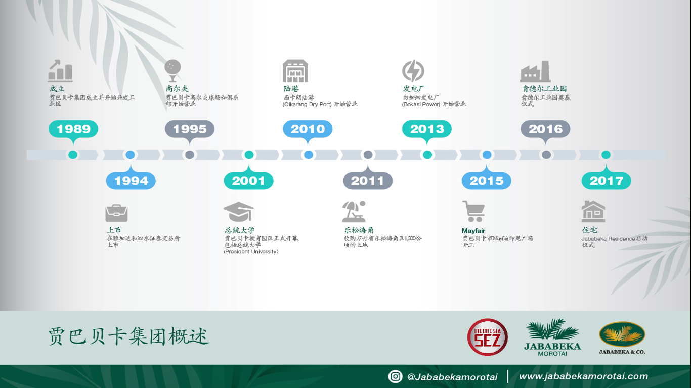 Jababeka Group(贾巴贝卡集团),成立于1989年,是印尼领先的城市开发公司。具有31年的丰富经验,贾巴贝卡已经有四个独立的城市开发项目:西卡郎贾巴贝卡市(Kota Jababeka Cikarang)、肯德尔工业经济特区(Kendal Industrial Special Economic Zone)、乐松海角经济特区(Tanjung Lesung Special Economic Zone)以及莫罗泰经济特区(Morotai Special Economic Zone)。