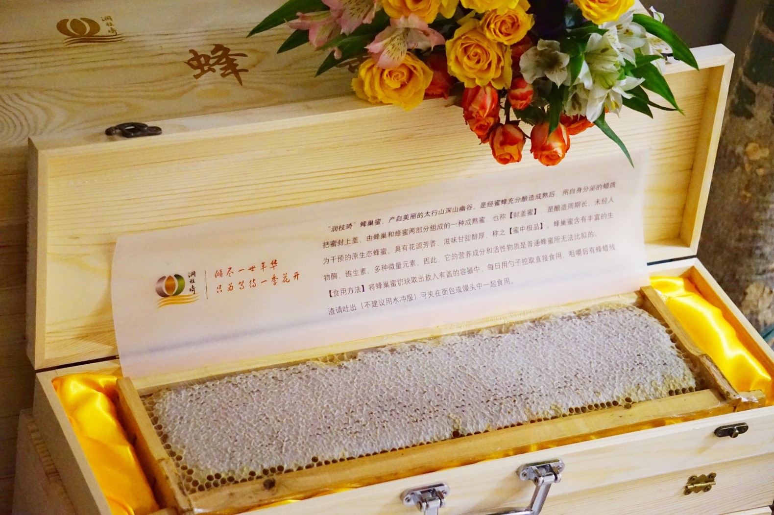 蜂巢内成分复杂,主要含有蜂王浆,天然消炎作用的蜂胶、树脂、抗癌杀菌物质10-羟基葵烯酸(王浆酸)、蜂蜡、多种球蛋白、黄酮类、芳香性醛类、醇类、各种复合酶、氨基酸、维生素、鞣质、糖类、苷类及铁、钙、铜、钾等微量元素和昆虫激素等。