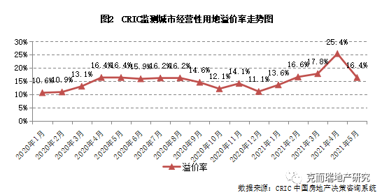 市场热度方面。由于本月集中土拍的重点城市出让地块基本均采取限地价的方式,加之热点三线城市成交量显著减少影响,本月溢价率较上月明显回调,环比大降9个百分点至16.4%。