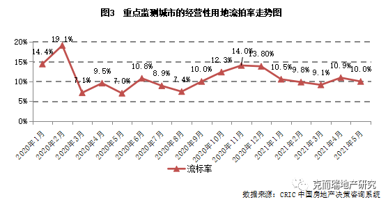 虽然本月为重点城市集中拍地高峰期,但由于优质宅地出让占比增加,土地流拍现象并未较上月恶化。以重点监测的城市来看,流拍率小幅微降至10%,处在合理水平。从流拍地块所在城市来看,三四线城市的下辖郊县仍为流拍主力,包括徐州邳州、韶关新丰、淮安金湖等,均有多宗土地遭遇流拍。此外,集中拍地的天津、济南和福州等城市也均有土地遭遇流拍,但流拍地块或为捆绑出让的商住用地,或为地理位置偏僻的宅地,或为租赁、安置等保障性住宅用地,对此类地块房企拿地意愿不高,因此惨遭流拍。