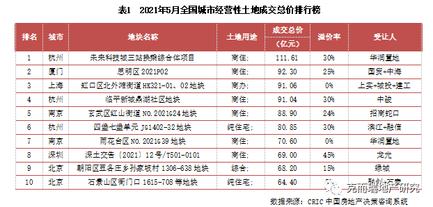 总结:2021年5月,重点城市首轮集中土拍高峰期来临,共有10个重点城市在本月完成了首轮集中土拍。虽然地价因城市成交结构改变而出现上涨,但在严格的控价机制下,本月溢价率较上月出现了明显回落,土地市场整体热度在供应量大增及调控机制进一步收紧的双重影响下得到了一定的控制。