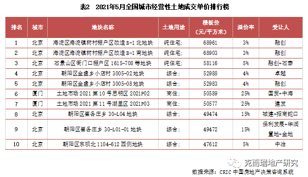 5月份,集中供地的重点城市迎来了拍地潮,共有10个城市在本月完成了首轮集中土拍,包括北京、深圳、杭州、南京、宁波、厦门、福州等诸多热点城市。由于是首轮供地,这些城市也推出了诸多优质用地入市,如北京中心城区海淀、朝阳共有12宗地入市出让,杭州未来科技城、钱江世纪城等热点板块也有诸多优质宅地出让,吸引了多家房企的竞争。最终,这些地块以上限价成交,如入围总价和单价TOP10的地块中仅有4宗地未及总价上限。