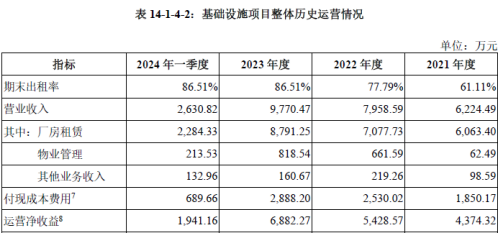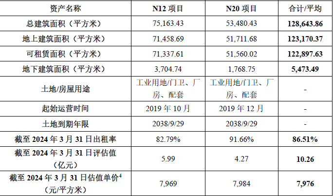 两个项目土地用途均为工业用地,房屋用途为门卫、厂房、配套,定位为高端制造的生产性厂房,建筑面积合计12.86万平方米。截至2024年3月31日,基础设施项目运营时间均已超过4年,整体出租率86.51%。